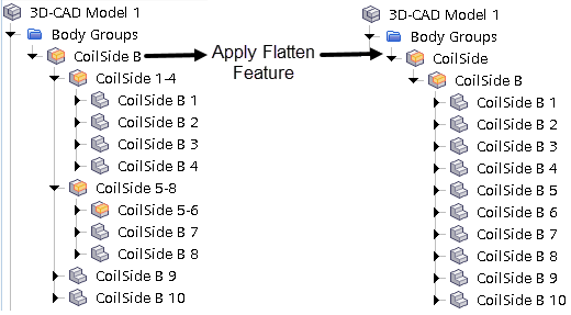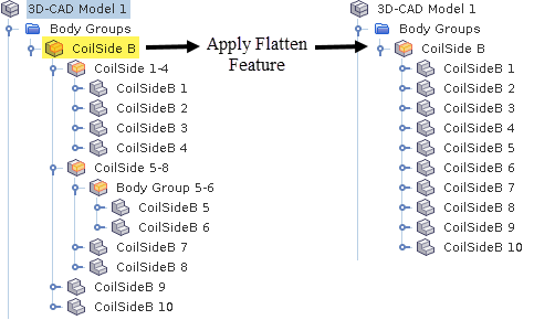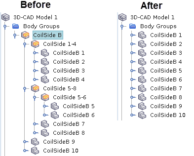 选定体组及其子体组中的所有体都移动至选定体组内,并且删除所有子体组。如果已激活删除体组,则会将体移到更高层级中,并且删除选定体组。下图显示应用展平特征之前和之后的树。