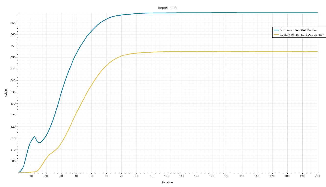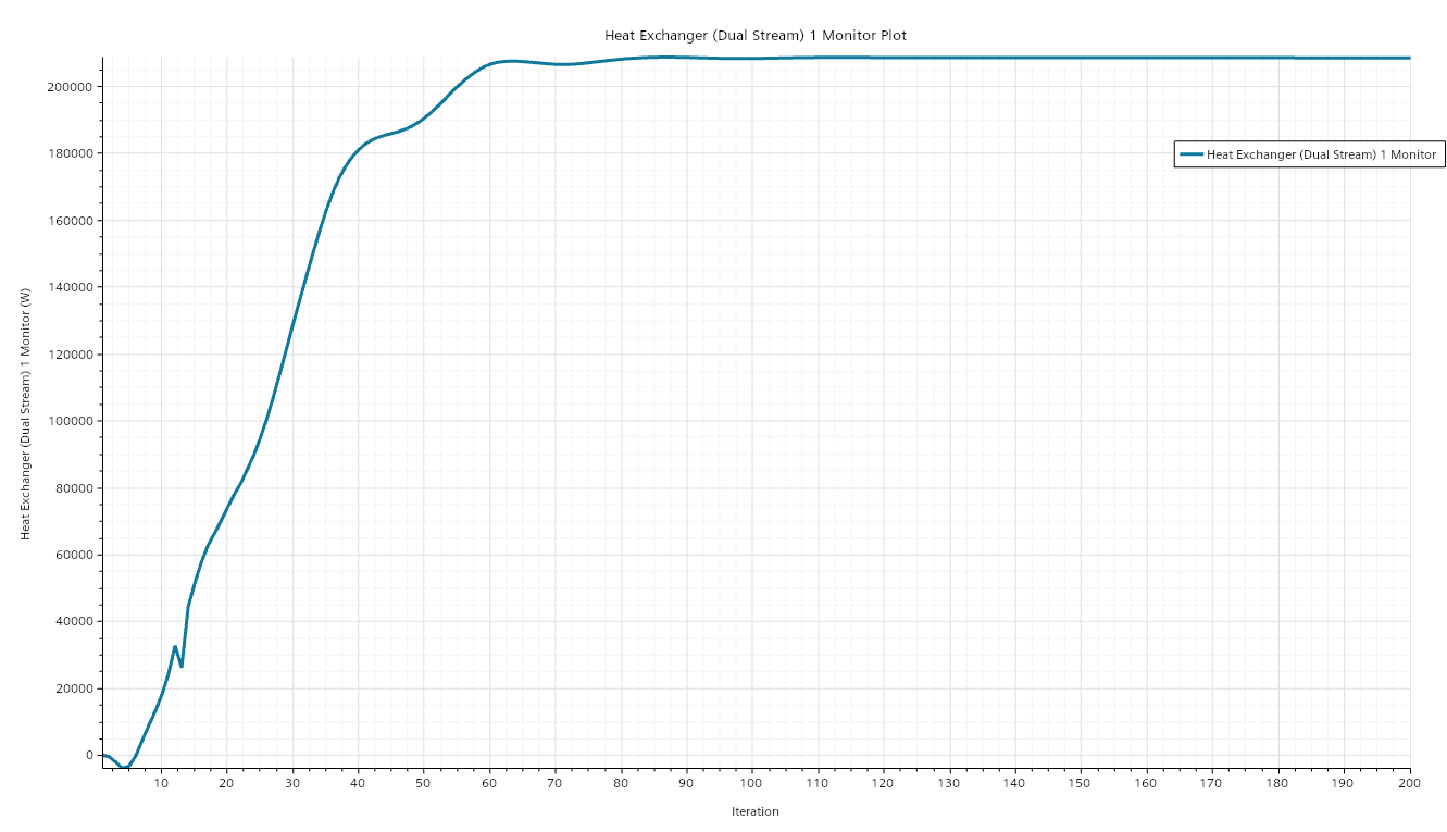 模拟达到稳态后,可以看到大约 208450 W 的热量从热冷却液传递至冷空气。