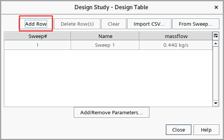 在设计表中,选择添加行,然后指定质量流量值为 0.448 kg/s 的扫掠。