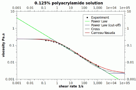 下图显示了 [23] 中模型的比较。三参数交叉模型和四参数 Carreau-Yasuda 模型非常适合此剪切薄化材料的实验数据。