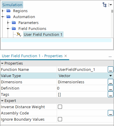 最初,节点具有默认名称,例如,User Field Function 1(用户场函数 1)。但是,可以重命名场函数,前提是该新名称尚不存在。如果以后在设置模拟时,Simcenter STAR-CCM+ 注册的原始场函数使用了与某个用户场函数匹配的名称,Simcenter STAR-CCM+ 将重命名该用户场函数。例如,假设用户在激活温度的能量求解器之前创建了场函数温度。当激活温度的能量求解器时,Simcenter STAR-CCM+ 将场函数重命名为 User Temperature。