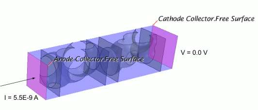 要模拟电池单元段中 10 A/m2 的近似放电电流,请在阳极集电器处定义该电流密度,并在阴极集电器末端定义零电势。