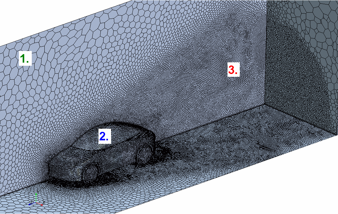 加密网格设置时,确保在所需区域中正确设置控制和值。以下示例显示了汽车尾流及其在模拟树(可以在其中加密每个区域)中的位置。为汽车表面设置了面控制,多面体体网格内的指定方向上(直至达到指定的角度以及距汽车表面指定距离为止)将形成尾流。