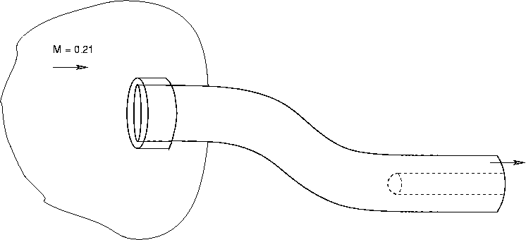 相关几何是在马赫数为 0.21 的自由流气流中的 NACA 型轴对称入口。由入口捕捉的气流先强制进入 S 形弯管,然后到达引擎面。