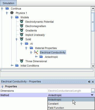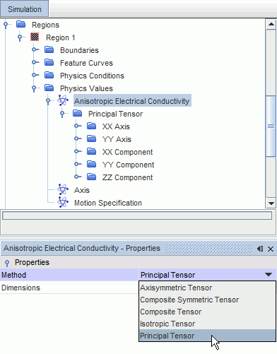 各向异性方法以两种形式提供:作为占位符对象,用于指示在区域下的张量节点中使用材料属性的各向异性方法;或者作为张量节点,位于物理模型的材料属性下。