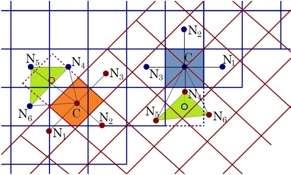 插值函数直接内含于代数方程组的系数矩阵中。 此方法可确保重叠网格的隐式耦合。 下图中使用虚线显示了两个受体网格单元,分别用于背景网格和重叠网格。