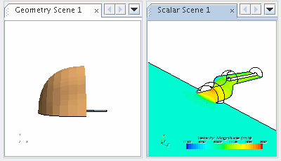 - 使用鼠标左键,可以沿所需方向拖动某一显示选项卡。在下图中,几何场景 1 显示选项卡将拖到右侧,使显示内容占据图形窗口的右半部分。 开始移动时,场景显示周围将出现红色轮廓。