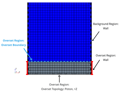 选择此选项可对圆柱体配置中的活塞进行模拟,该配置中只有一个开放的活塞表面定义为重叠边界。此选项要求在重叠边界的透视图中提供背景网格保持活动状态的方向。此类配置的典型拓扑如下所示:
