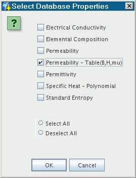 在选择数据库属性对话框中,激活 Permeability - Table (B, H, mu)(渗透率 - 表 (B,H,mu)),然后单击确定。