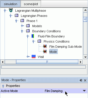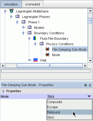 Selecting Film Damping mode adds a physics condition Film Damping Sub-Mode. The behavior of the particle as it impinges on the wall having passed through the film can be specified as stick, rebound, escape, or composite.