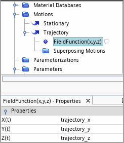 - FieldFunction(x,y,z) — 用于位置值,作为时间函数。将三个标量场函数分配给三个轨迹位置组分。对轨迹运动使用分析描述时,此选项很有用。