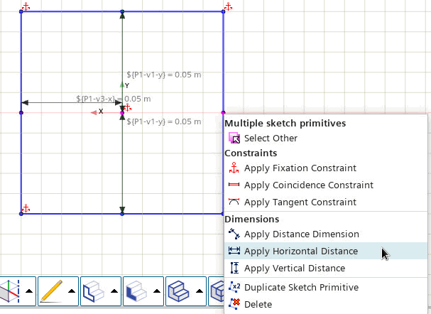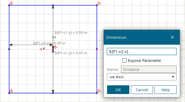 在参考模拟中,所有必需尺寸均已预定义,可供您在优化研究中使用。通常,要将草图尺寸添加到 B-样条,首先使用 <Ctrl> 键进行多重选择以选定两个点,并右键单击其中一个点,然后输入尺寸作为参数名称: