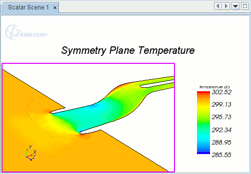 在以下示例中,宽度和高度已设为显示尺寸的 0.7,为简单的文本注释和设为垂直方向的标量颜色条留出了空间。(仅当此功能的节点处于选中状态时才显示模型窗口的边框。)
