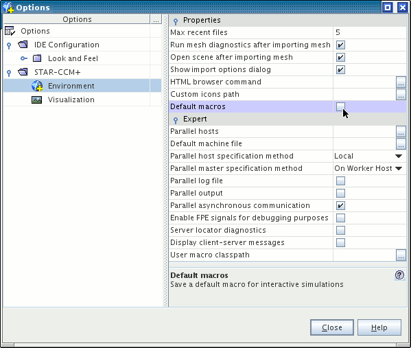 - 在对话框的左侧,选择 Simcenter STAR-CCM+ > 环境,然后在对话框的右侧,停用默认宏属性。