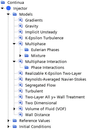 在该模拟中,流体是湍流且问题涉及多相流体和空化。此次分析需要三种流体(空气、水和水蒸气)。但是,由于这些流体占据相同的域,所以仅需要一个连续体和一个区域即可设置模拟。默认情况下,当网格转换为二维时会创建一个称为物理 1 2D 的连续体。