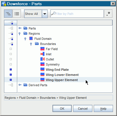创建下压力报告、监视器和绘图 该伴随流体分析的目的是寻找可增加机翼产生的下压力的设计。要监测下压力,创建一个压力报告: 右键单击报告节点,然后选择新建 > 流/能量 > 力。 将该报告重命名为下压力。 选择下压力节点,然后将方向 设为 [0.0, 0.0, -1.0]。 编辑部件属性,展开区域 > 流体域 > 边界节点,然后选择机翼端板,机翼下部元件,和机翼上部元件。 单击确定。 右键单击报告 > 下压力节点,然后选择根据报告创建监视器和绘图。