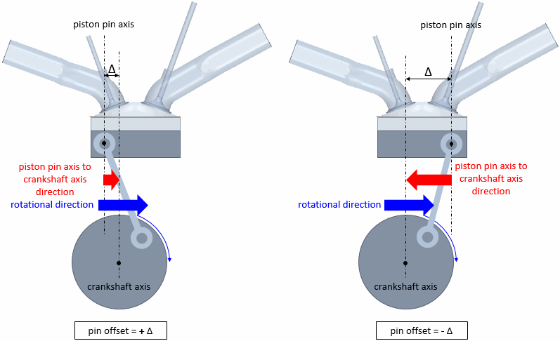 Simcenter STAR-CCM+ In-cylinder 中的针偏移定义为活塞针轴和曲柄轴之间的距离。针偏移的符号取决于曲柄上半部分的旋转方向以及从活塞针轴到曲柄轴的方向。