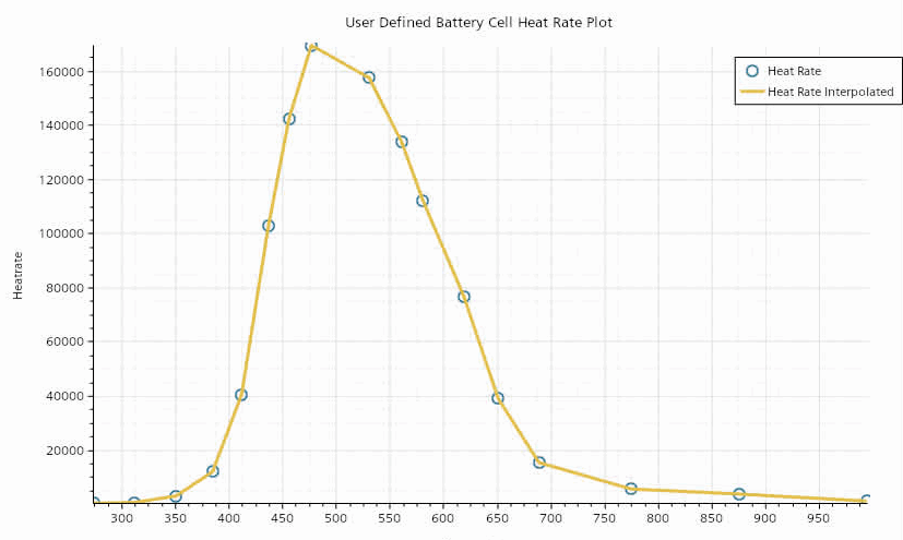 配置此模型,使其在用户自定义电池电芯内温度达到触发温度 373.15 K 时激活。要计算热失控过程中电芯固体部件释放的热量,热失控放热模型使用热速率表提供的温度范围内的电芯自加热率。(此类表可以通过执行 ARC 测试获得)。
