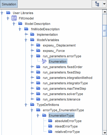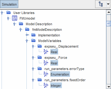 枚举 从下拉菜单中选择一个选项(FMU 模型描述文件包含决定可用方法的枚举类型定义) 字符串 键入字符串。不能使用表达式。 布尔运算 激活复选框为 true,停用复选框为 false。 通过展开已导入库节点下的相关节点,可以将任何 FMU 变量和类型定义的数据类型可视化: