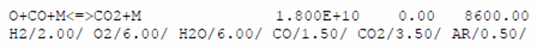 如果在机制中指定了第三体反应,则写入反应,其中额外的组分 M 作为反应物、产物或同时作为反应物和产物。反应下面的行中提供了有关某些组分的增强第三体效率的辅助信息。第三体组分的名称后跟其增强因子。