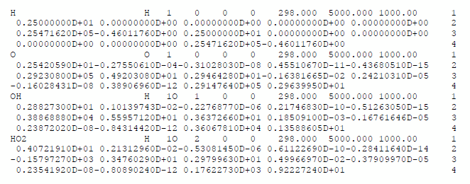 - 第 1 行:组分的名称、组分的元素成分、用于定义多项式拟合对热力学数据有效的温度范围的三个温度。例如,以下示例中的三个温度 (K) 显示了低温拟合 (298.000)、高温拟合 (5000.000) 和这些拟合之间的公共温度 (1000.00)。