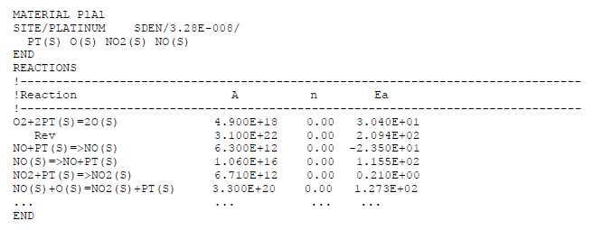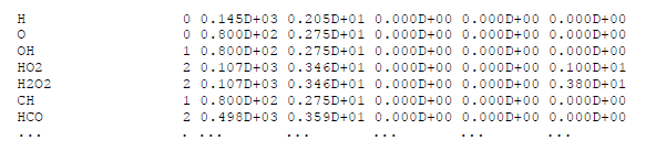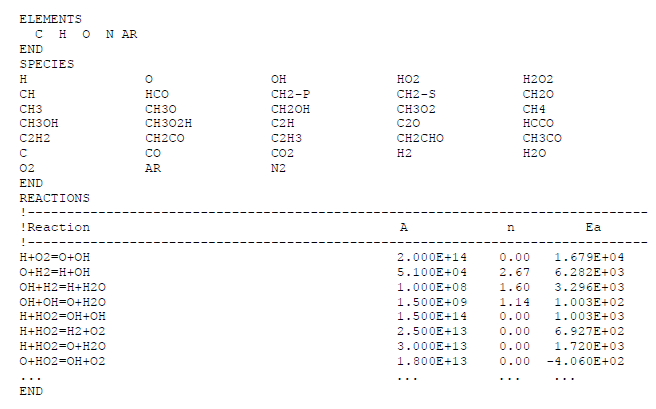 气相数据文件说明了机制中包括的化学元素和组分。元素和组分后跟一个列表,其中包含组分可参与的可能反应以及阿列纽斯定律 Eqn. (3365) 用来计算每个反应的速率常数(Eqn. (3357) 中的 )的相应变量 、(Eqn. (3365) 中的 )和 。