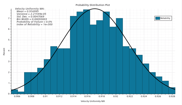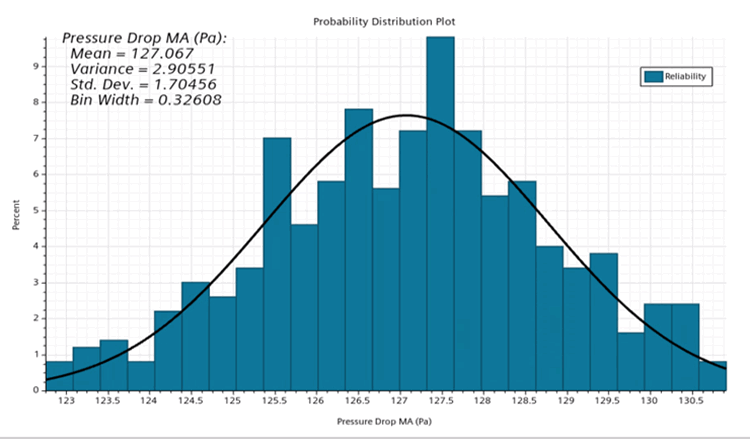 通过为压降和均匀性响应创建概率分布绘图(直方图),可以分析可靠性研究的结果。当考虑不确定性时,这些绘图会给出压降值和均匀性值的预期分布。