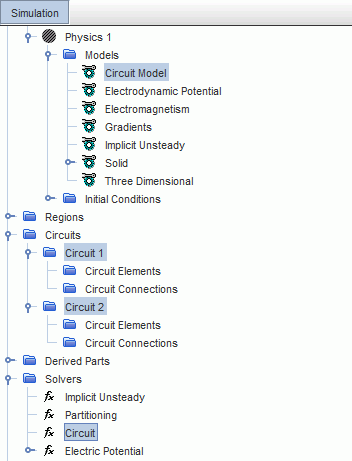 电路模型没有属性,但会激活和节点,用于设置电路求解器属性。可以创建多个电路并为每个电路单独设置电路求解器属性:每个电路的元件和连接存储在电路节点下的相应 [电路名称] 节点中。