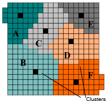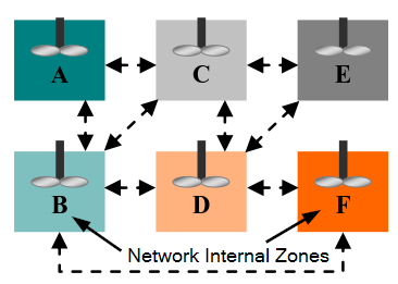 | 流体区域(划分为 N 个网格单元集群) | N 个内部区中的网络(每个网格单元集群一个) | 与外部物理连续体关联的流体区域 |