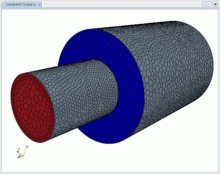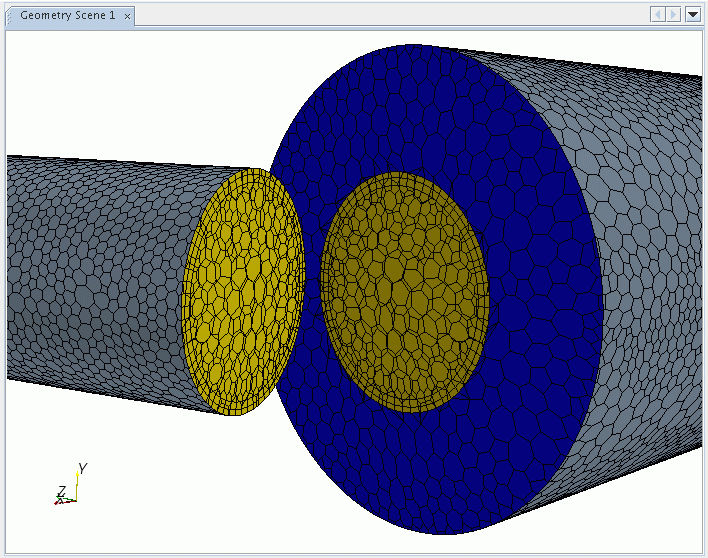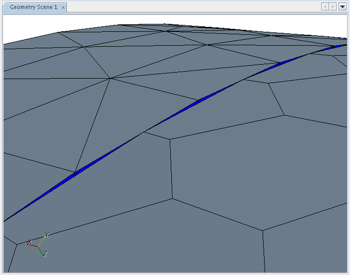 如果边界周长完全相同但是网格分辨率不同(例如,当一个四面体类型的网格与一个多面体类型的网格接合时),则原始边界的小部分会剩下,如下图中以蓝面高亮显示的部分: