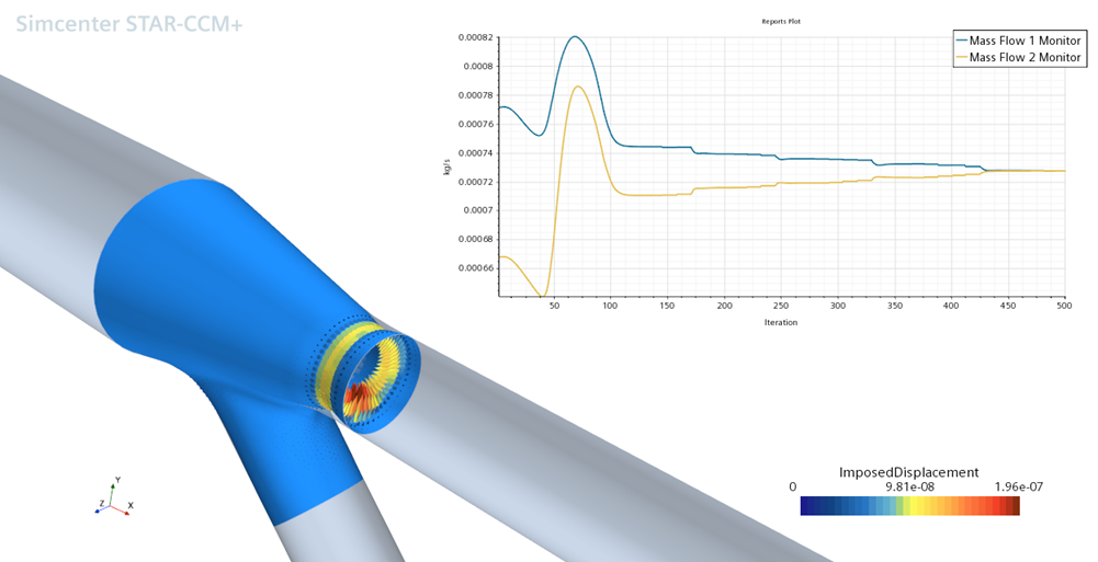 最终结果演示了歧管 Y 型接头的变形如何在 5 个优化循环内实现出口之间的平衡质量流量分割。通过每个出口的质量流量现已平衡,值为 7.27E-04 kg/s。