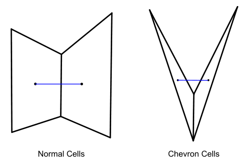 Chevron 网格单元是在公共面以一定角度相交的细薄网格单元对,该角度使得连接网格单元中心的线不会穿过公共面。
