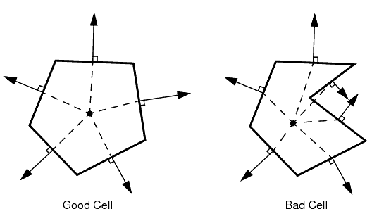当偏斜角大于或等于 (可能出现在凹网格单元中,其中两个网格单元的形心均位于边界面的同一侧)时,通常会导致出现求解器收敛问题。之所以会出现问题,是因为已传输标量变量的扩散项在分母中包含点积 ,而当 和 之间的角度为 时,此点积为零。尽管 Simcenter STAR-CCM+ 会注意避免出现这种除以零的错误,但在这种情况下,扩散计算的精度和稳定性均会降低。