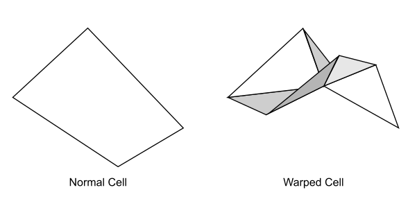 网格单元翘曲质量低于 0.15(对应于网格单元翘曲角度 )的网格单元被视为坏网格单元。通常,网格单元翘曲角度越小,其质量越佳。