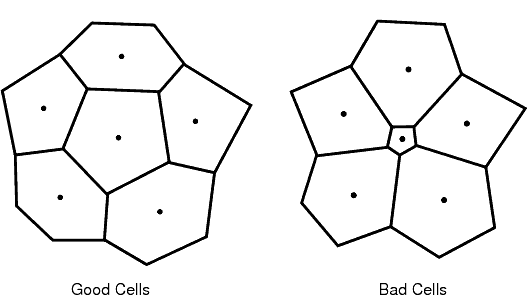 - 要获得最佳精度和稳定性的对流通量,连接相邻网格单元形心的线最好尽可能靠近分隔网格单元的面的形心。此问题的二维示例如下所示: