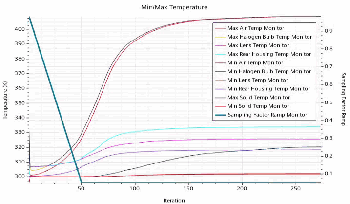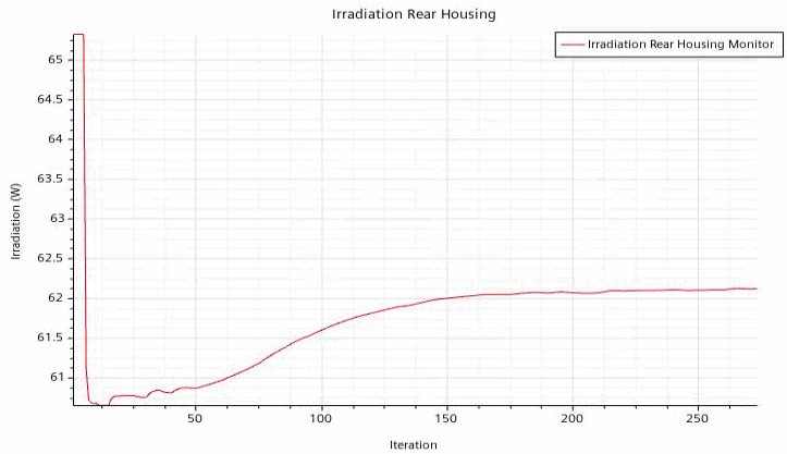 In the Graphics window, click through the Min/Max Temperature Plot and the Irradiation Rear Housing Plot tabs.
