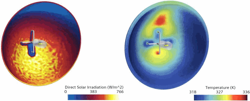 The following screenshots show the direct solar irradiation and the temperature hotspots on the reflector of the headlamp: