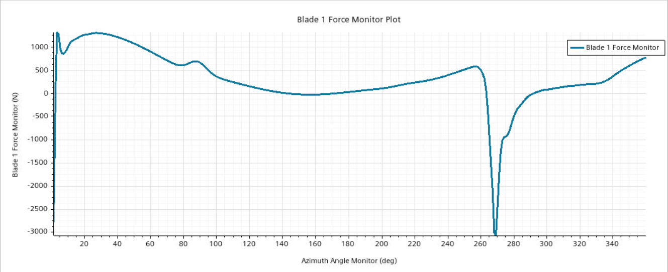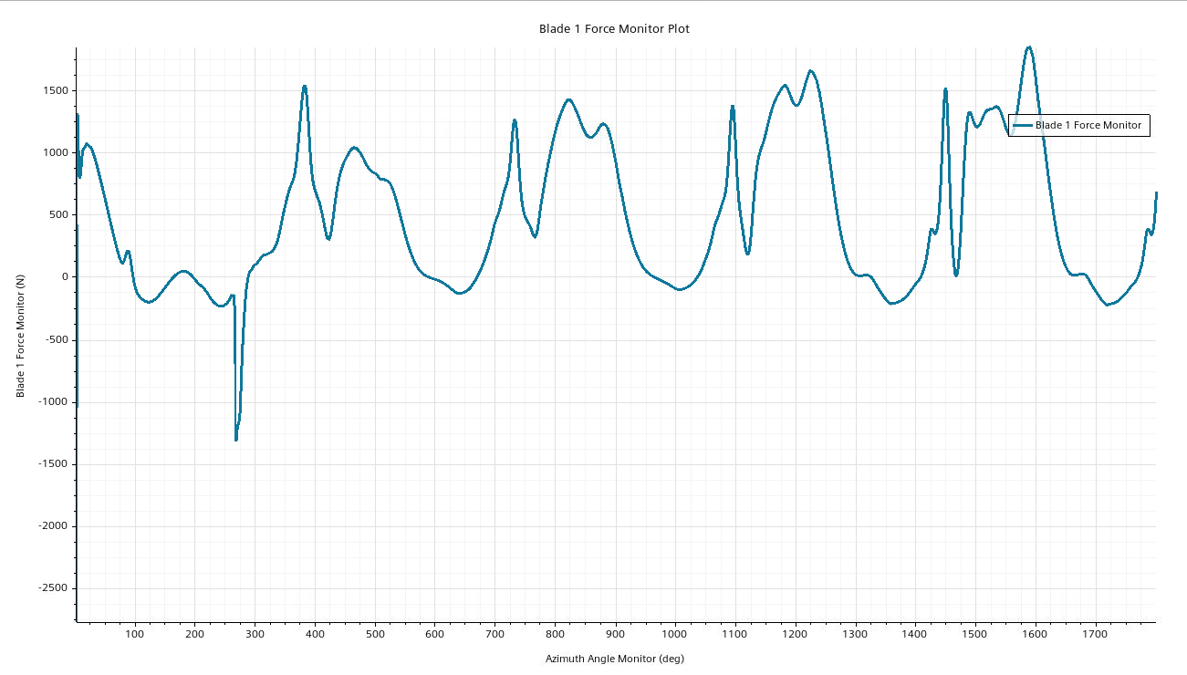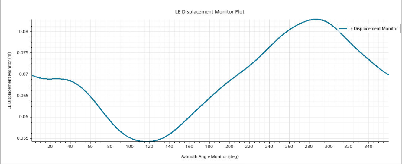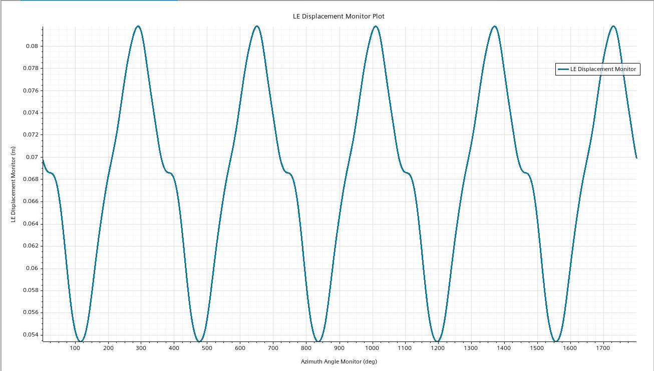 由于仅运行一次完整旋转模拟,因此结果很可能不收敛。但是,由于需要大量时间步数,因此获得收敛的转子叶片气动弹性研究结果需要高昂的计算成本,且非常耗时。以下为 5 次旋转(1800 个时间步)后的绘图,可供比较: