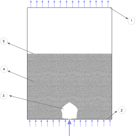 气泡的形状及其数量增长已被报告 ([970])。注气孔宽 15 mm。孔口处的表面气速为 10 m/s。入口其余部分的表面气速为 0.25 m/s,即让床层流化的最小气速。几何如下所示。