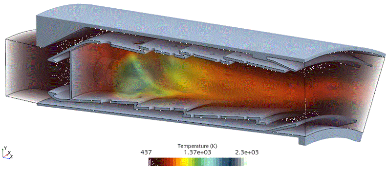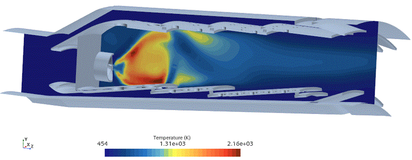 温度场景显示流体域的剖面。您可以发现,就在液滴汽化后,燃料燃烧区域的温度最高。