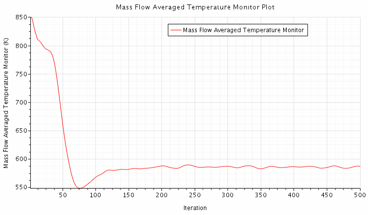 此模拟中燃烧出口的平均温度低于 600K。工业燃烧器模拟的出口温度可能达到 1200 K 左右。平均质量流量温度监视器绘图对显示模拟接近收敛时达到稳定温度非常有帮助。