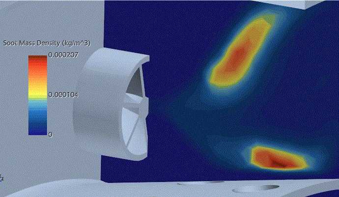 碳烟场景显示碳烟的最高量级 (2 x 10-4 kg/m3) 位于火焰的最热区域。