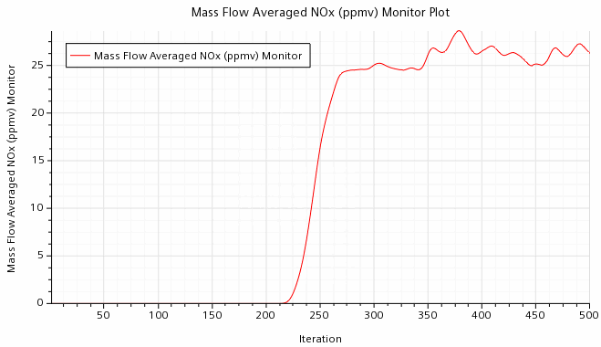 求解器设置为在 200 次迭代后开始求解氮氧化物,之后,出口的氮氧化物排放的质量流量增加,并在稍小于 25 ppmv 处波动。自定义场函数计算干排放,并按 15% O2 进行修正,因为这在工业中很常见。但是,由于教程使用简化设置,此模拟的氮氧化物并不代表工业水平。