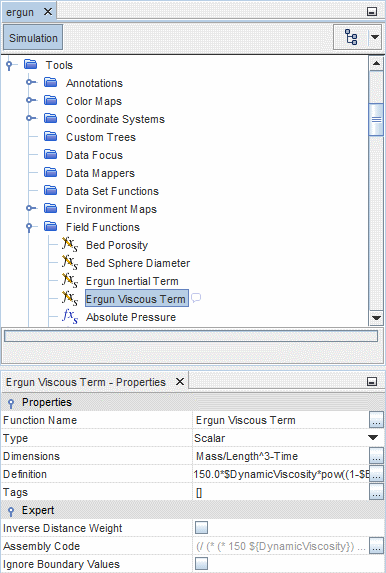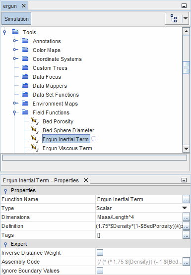 要在 Simcenter STAR-CCM+ 中实现此模型,需要为其中每个项创建用户场函数。首先定义体积孔隙率和平均颗粒直径(在此示例中设为常数值)的场函数。然后,这些值将在这两个项的场函数中使用。