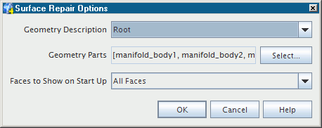 表面修复选项对话框将显示,它包含的选项与启动表面准备工具时出现的对话框相似。唯一的例外是启动时显示的面菜单,通过该菜单可以仅显示所有面或无面。当前可见面选项不可用,因为更改部件意味着当前可见面不可能处于新的活动模型中。默认几何描述设为当前所修复的描述。