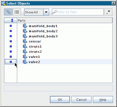 - 单击选择按钮。在选择对象对话框中,选择或取消选择部件或区域,单击该项目左侧的按钮,如图所示: